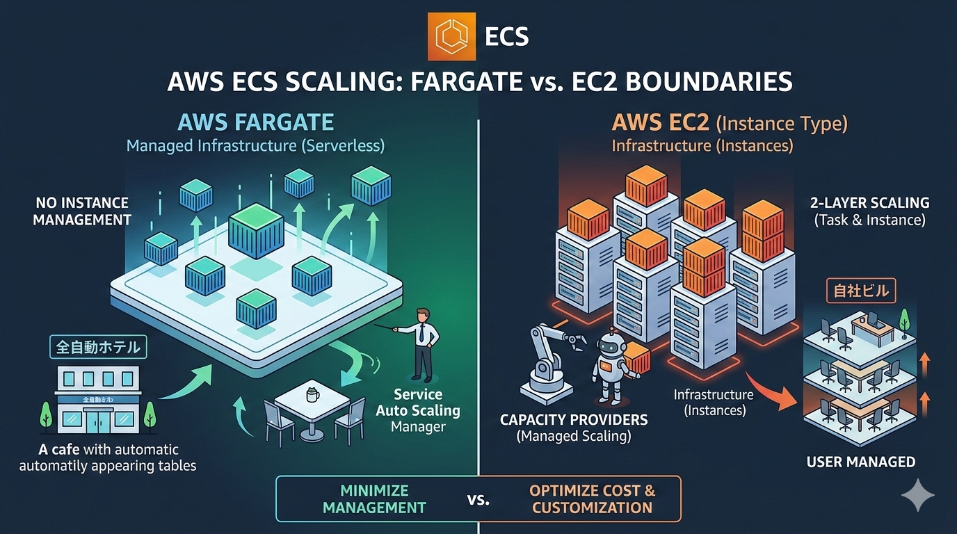 FargateとEC2、それぞれのスケーリング管理の境界線は以下の通りです。