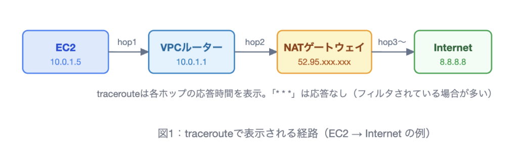 | 経路確認 | traceroute 8.8.8.8 | NATゲートウェイ経由の経路確認 |