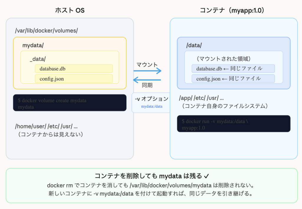 コンテナは停止・削除するとデータが消えます。データを永続化するにはVolumeを使います。