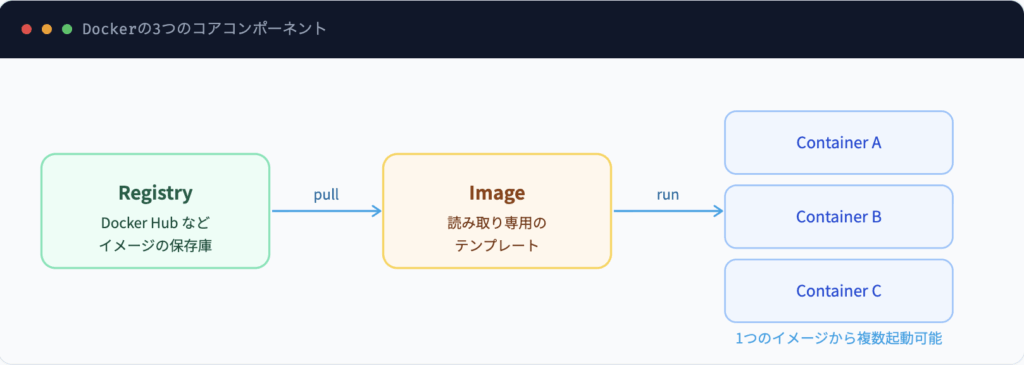 例え:イメージ=クッキーの型、コンテナ=焼き上がったクッキー、レジストリ=型のカタログ(Docker Hub)。ひとつの型から何個でも同じクッキーが焼けます。