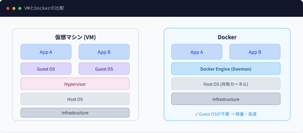 従来の仮想マシン(VM)と比べると、DockerコンテナはホストOSのカーネルを共有するため起動が速く、消費リソースが少ないのが最大の特徴です。