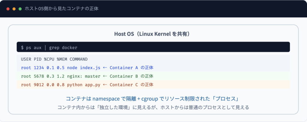 Dockerコンテナは「独立した仮想サーバー」のように見えますが、ホストOS側から見ると実は「ただのプロセス」です。仮想マシン(VM)は専用のOSカーネルを持ちますが、Dockerコンテナはホストのカーネルをそのまま共有します。