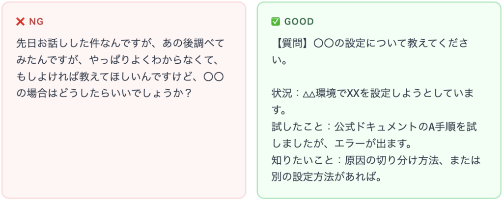 ・質問は「状況・試したこと・知りたいこと」の構造化