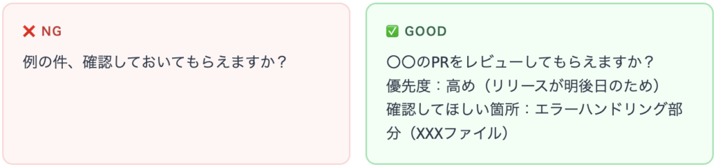 依頼は「何を・いつまでに・どこを」が明示されていないと、受けた側が判断できません。相手が動けるだけの情報を依頼文に込める意識を持ちましょう。