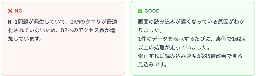 → 技術用語より「ユーザーへの影響」から話し始める