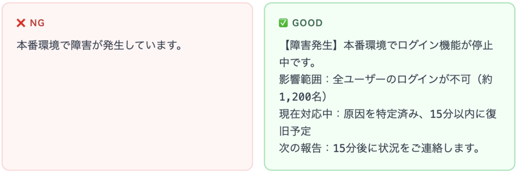 → 問題報告は「影響範囲・対応状況・次の報告時間」をセット