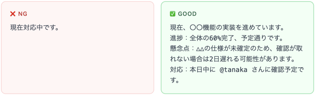 完了事項・影響範囲・次のアクションの3点をセットにするだけで、確認コストがゼロになります。