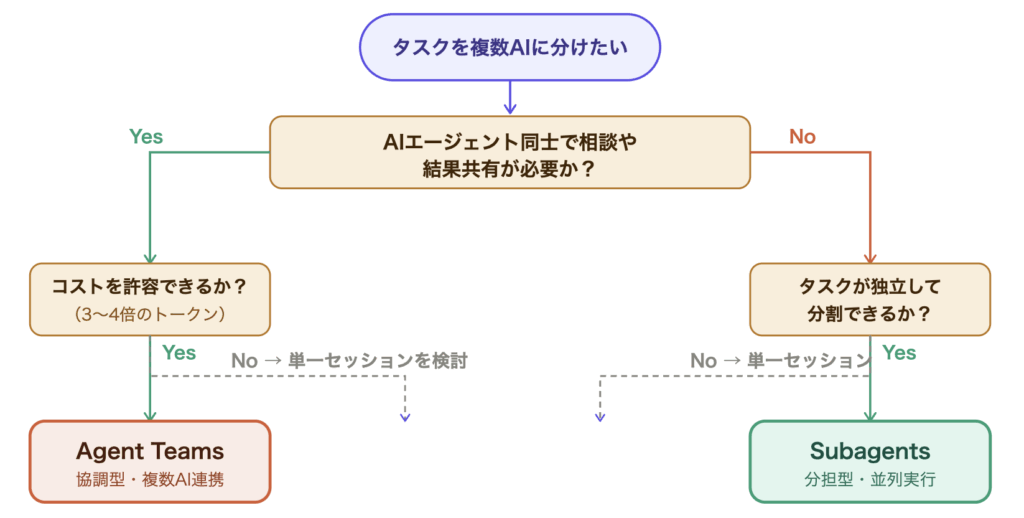 使い分けの判断は「AIエージェント同士で相談や結果共有が必要か?」という問いからスタートします。