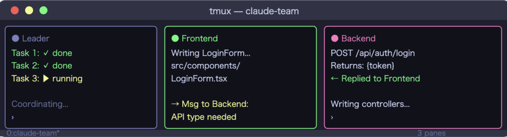 💡 tmuxはAgent Teamsの必須要件ではありません。まずtmuxなしで動かしてみて、エージェントの動きを視覚的に確認したくなったタイミングで導入するのがおすすめです。