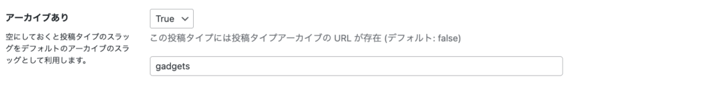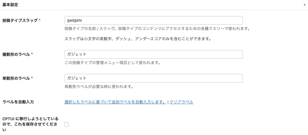 | 投稿タイプスラッグ | gadget | 小文字の英数字・ハイフンのみ使用可 |