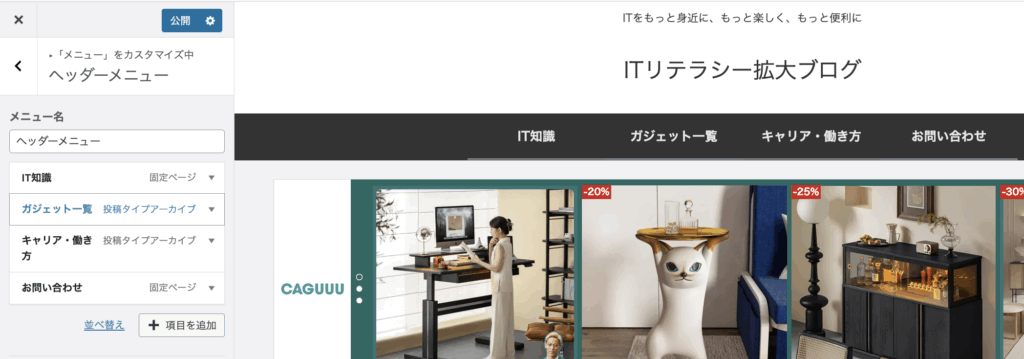 - 「ガジェット一覧 投稿タイプアーカイブ」を選択するとヘッダーメニューに追加される